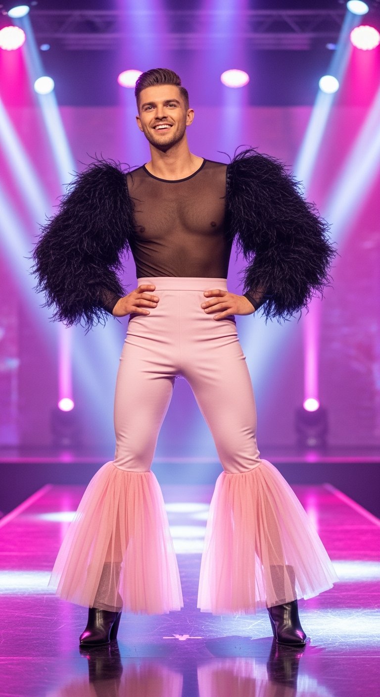 Wearing a sheer black top with dramatic feathered arms and flowing pink trousers, he strutted across the stage like it was Fashion Week. The moment he raised his arms and posed with unapologetic energy, the crowd erupted in cheers. Judges watched in awe as he served flair, choreography, and unapologetic authenticity.