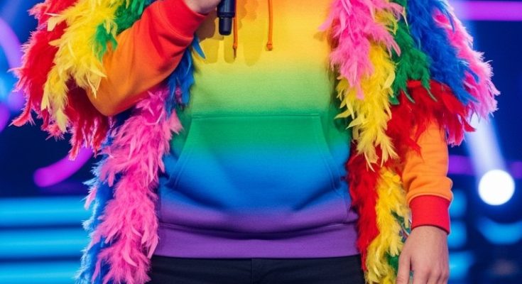 Not all auditions aim to impress with perfection—some aim to entertain, and this one did exactly that. A contestant in a rainbow tie-dye hoodie and feather boa stepped onto The X Factor USA stage, immediately drawing attention with his vibrant outfit and equally colorful personality.