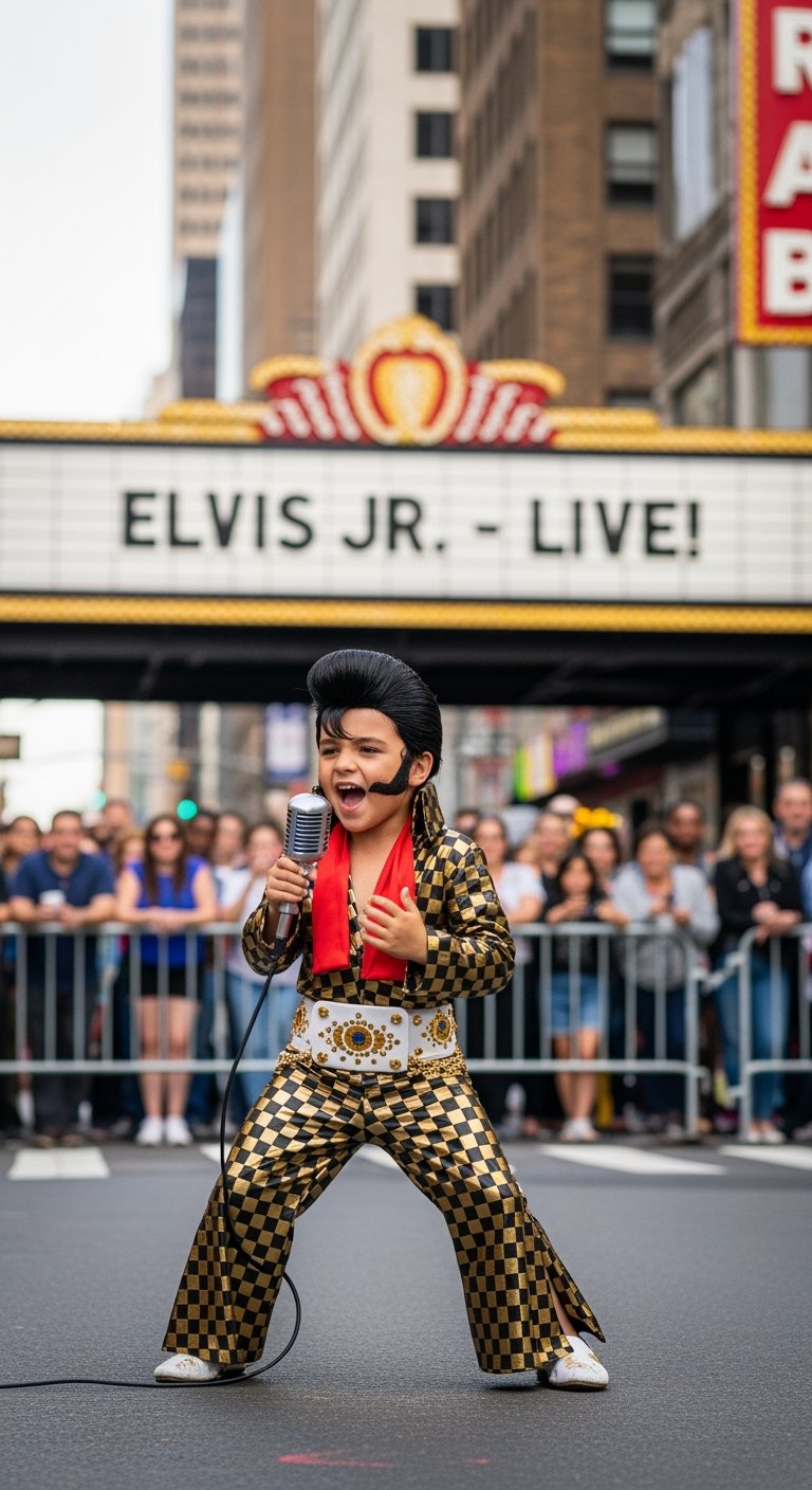 Tiny footsteps echoed as the boy, wearing a leather jacket two sizes too big and slicked-back hair, stepped onto the stage. He looked more like someone playing dress-up than a serious contender. A few audience members even exchanged amused glances.