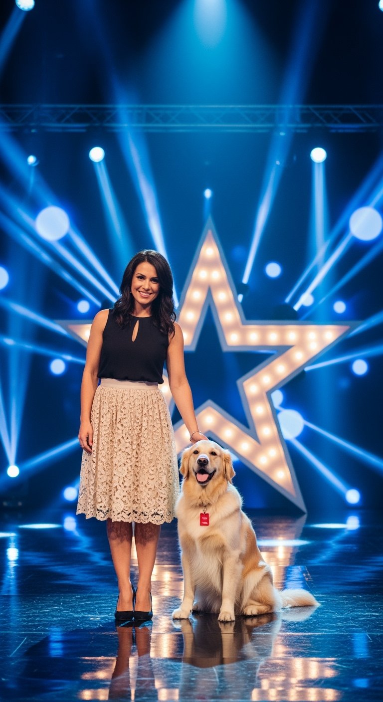 Pam, dressed in a classic black top and an elegant white skirt, introduced herself and her furry partner with calm confidence. As the judges looked on with curiosity, Pam took her place at the bench behind them and began to sing a classical operatic piece.