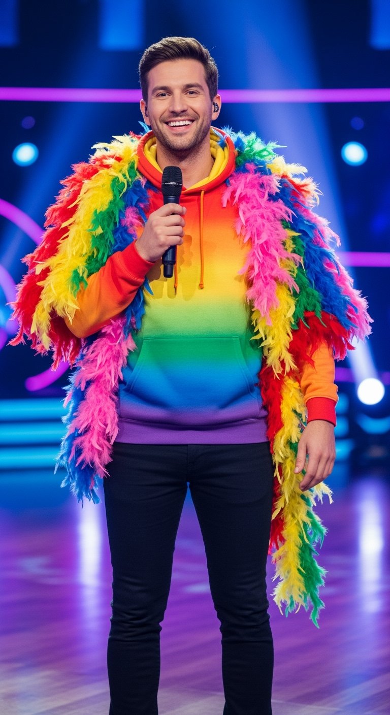 Not all auditions aim to impress with perfection—some aim to entertain, and this one did exactly that. A contestant in a rainbow tie-dye hoodie and feather boa stepped onto The X Factor USA stage, immediately drawing attention with his vibrant outfit and equally colorful personality.