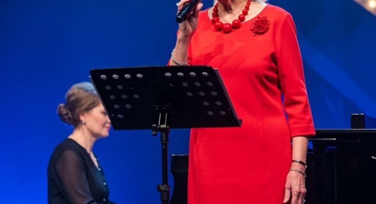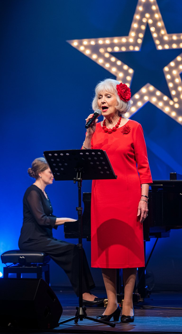 Dressed in a vibrant red dress with a red flower adorning her silver hair, Nora took to the stage with grace and poise. Leaning slightly against a grand piano for support, she sang passionately into a handheld microphone, accompanied by her daughter on piano. From the first note, it was clear that she possessed a rare talent. Her rendition of the classic song showcased not only her vocal strength but also her ability to convey deep emotion through music.