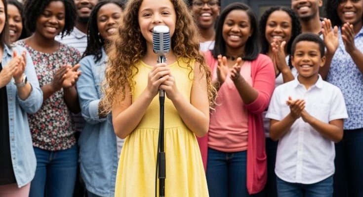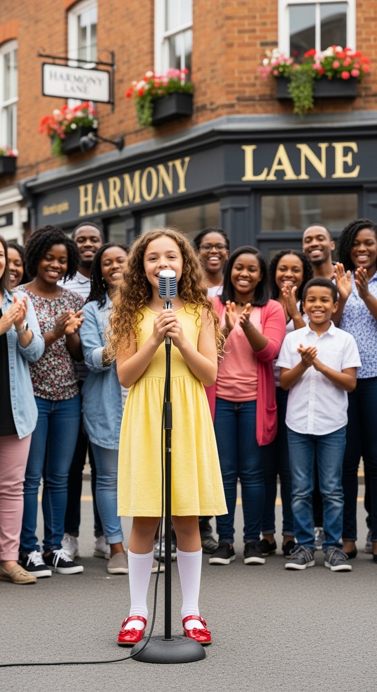 She stood barefoot on the pavement, a small girl no older than eight, holding a cheap plastic microphone connected to a tiny speaker. Her dress was faded, her hair tied in uneven braids, but her eyes—those eyes—held a quiet confidence that didn’t match her size.