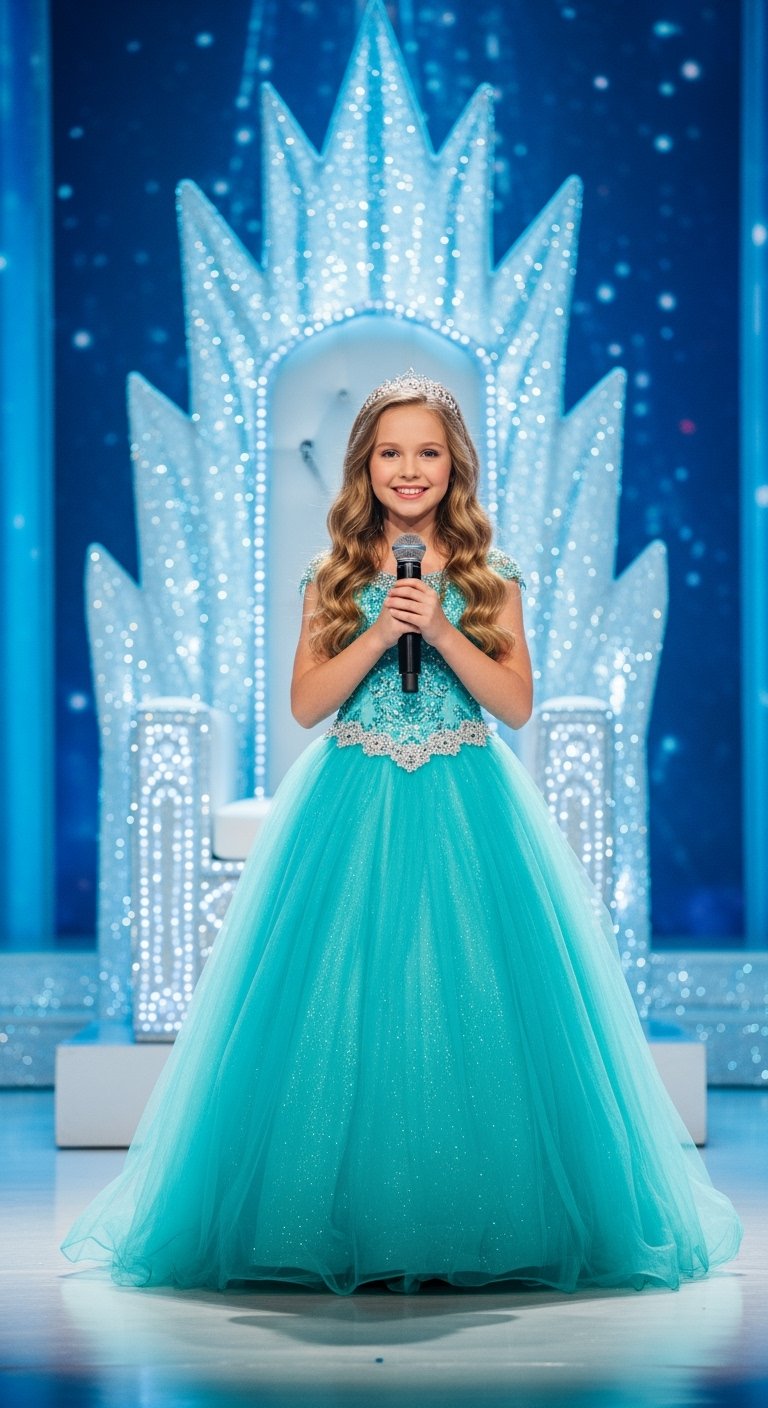 From the moment the curtain lifted, the stage transformed into a winter wonderland. A young girl in a dazzling icy-blue gown stood before a glittering crystal throne, her presence alone enough to capture the audience’s imagination.