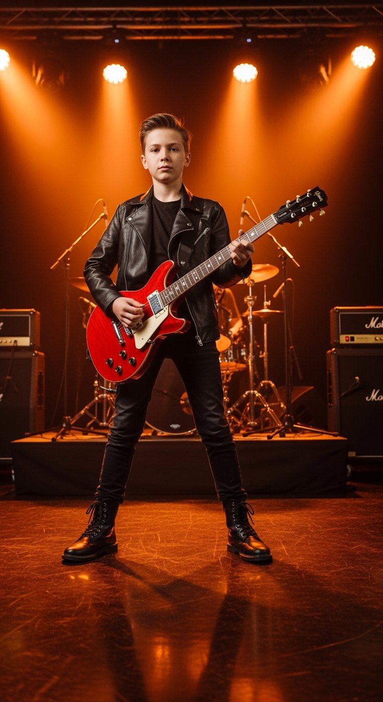 From the moment his fingers touched the strings, the stage was transformed into a rock concert. Dressed in a black leather jacket and boots, he played with passion and skill, filling the room with the kind of sound usually reserved for seasoned professionals. The judges and audience quickly rose to their feet, clearly swept away by his talent.